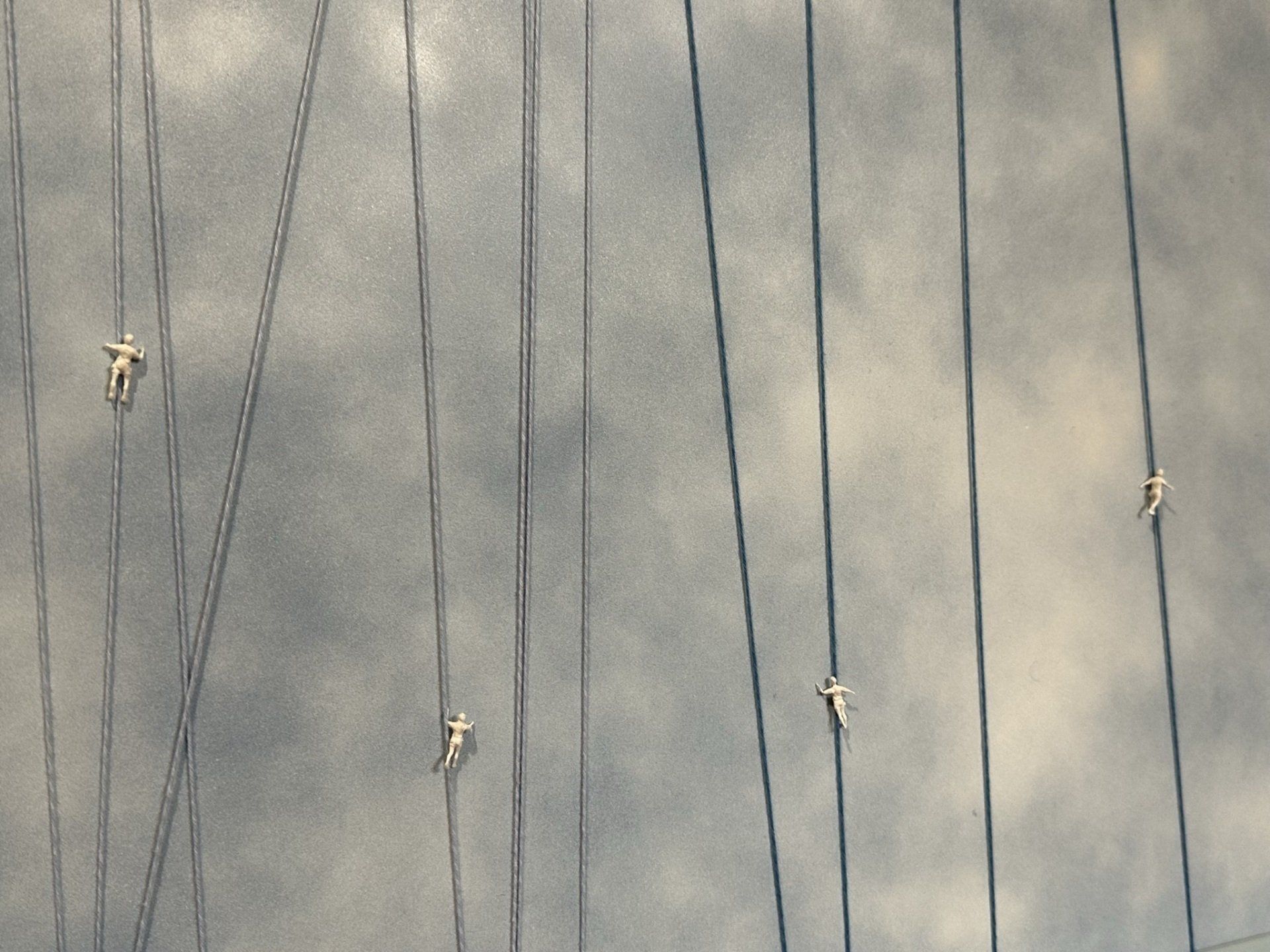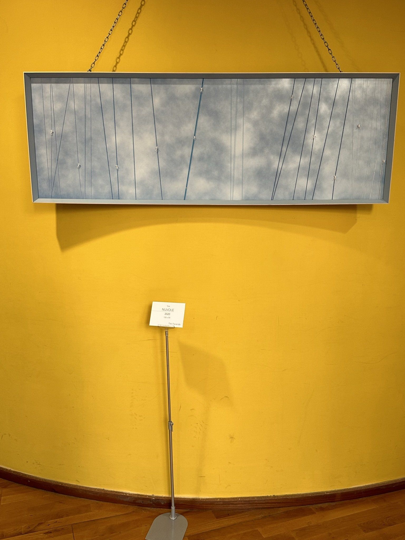 Ci soffermiamo infine su Nuvole (2020), opera di particolare interesse poiché affronta il tema della pandemia di Covid-19. Sullo sfondo di un cielo nuvoloso sono tesi dei fili, alcuni dei quali presentano piccole figure bianche. L’opera si presta a una duplice interpretazione. La prima riguarda il desiderio di evasione nella sfera dei sogni, che molti di noi hanno provato quando, rinchiusi in casa per via del lockdown, hanno cercato di sfuggire all’incubo -purtroppo avveratosi- della diffusione del Covid-19. Una seconda lettura concerne invece la precarietà esistenziale, la sensazione di “vita appesa a un filo”, esperita da ciascuno di noi nel momento più buio della pandemia. In questo caso, l’assenza degli omini bianchi su alcuni fili rappresenterebbe la salita al cielo di tutti coloro che si sono ammalati e non sono riusciti a sconfiggere il virus.