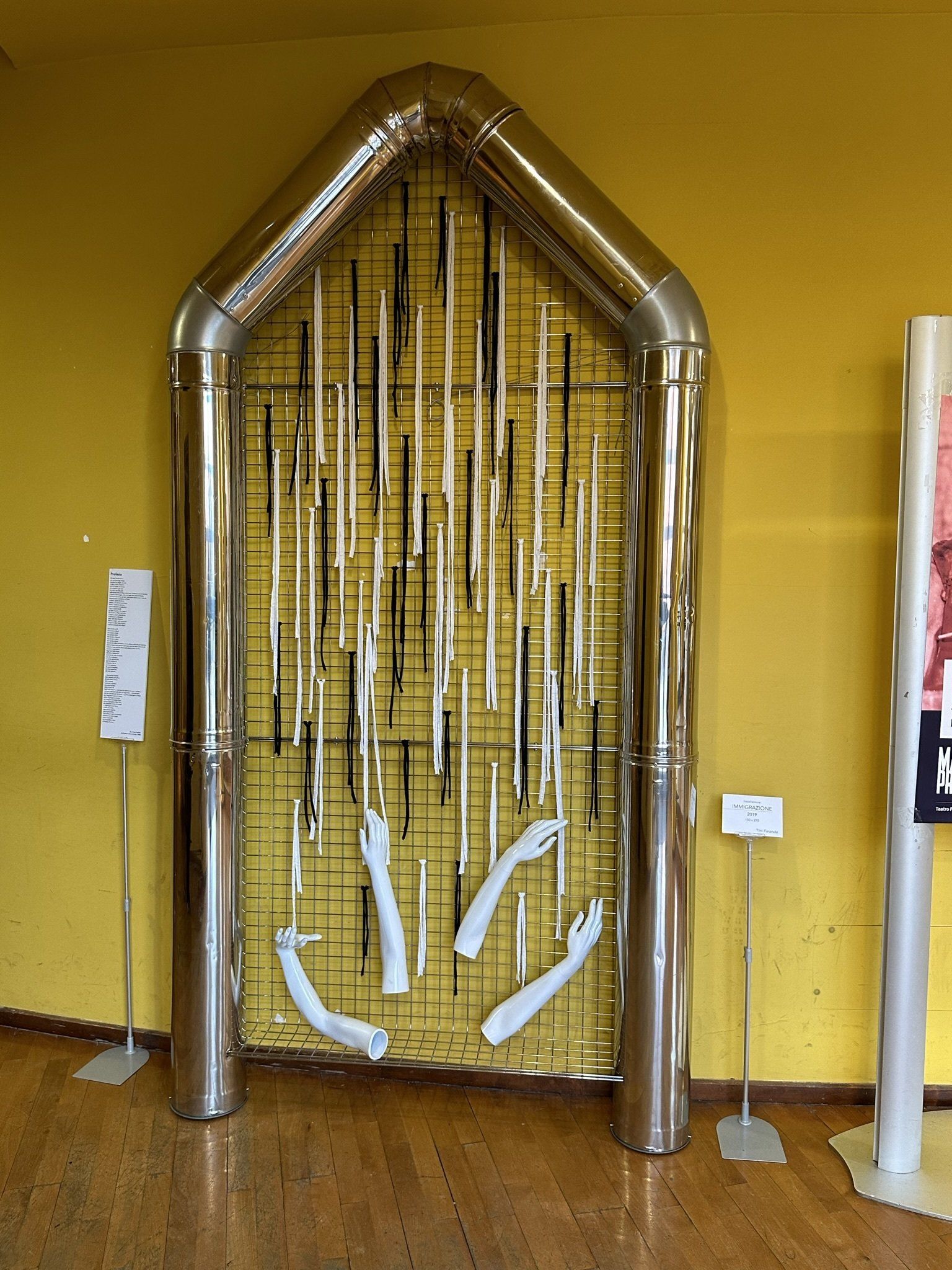 Immigrazione (2019) propone, invece, una pungente riflessione sul dramma dei “viaggi della speranza” intrapresi dai profughi dalle coste del Nord Africa verso la Sicilia. Nel gommone, formato da una rete e tubi metallici, vi sono delle braccia di manichini che simboleggiano le bracciate sferzate nell’acqua dai migranti quando, come purtroppo spesso capita, le imbarcazioni stracolme si ribaltano nella notte. Il bilancio è indicato dalle corde bianche e nere legate alla rete: qualcuno ce la fa, qualcun altro viene inghiottito dalle onde gelide del mare. L’artista con quest’opera grida con forza una domanda: è possibile che ai confini del mondo occidentale, progressista e culla dei diritti dell’uomo vi sia ancora qualcuno che debba lottare per sopravvivere? Viene in mente una celebre frase di Antonio Gramsci: “Indifferenza è abulia, è parassitismo, è vigliaccheria, non è vita. Perciò odio gli indifferenti”.